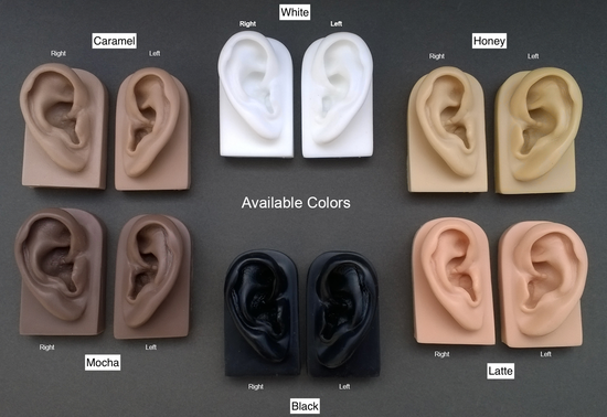 The real life-like model ear measures 1 5/8″ wide, 2 3/4″ tall, by 1 1/2″ deep. It is manufactured at our facility and is made out of silicone rubber so it feels soft and life-like.
